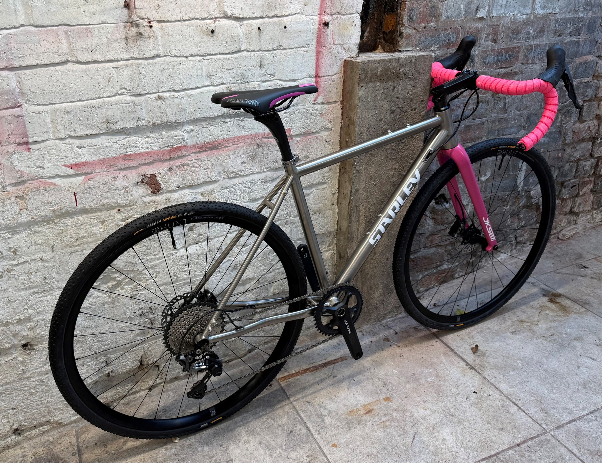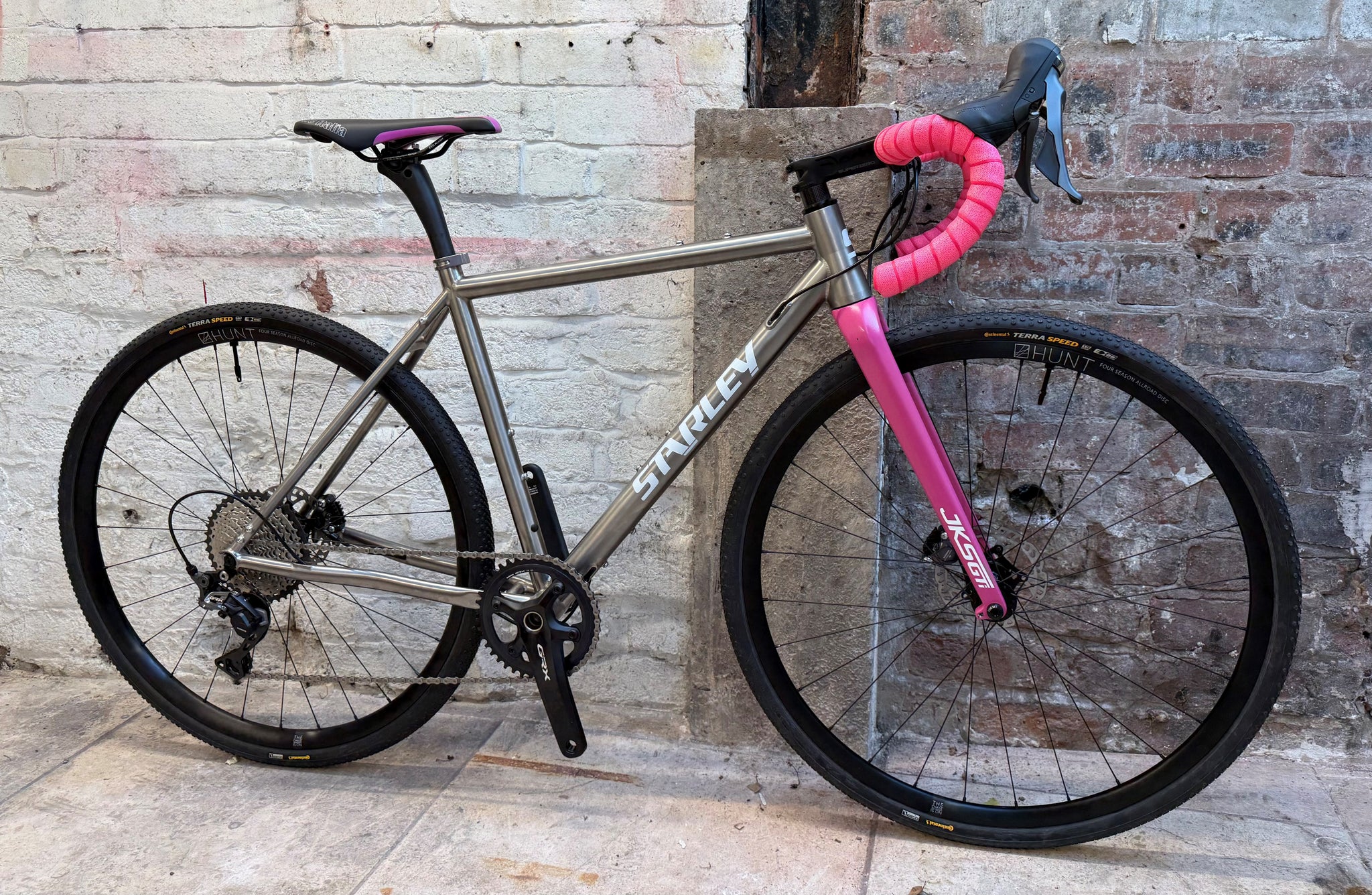 - Frameset : Starley JKS-GTi with Aerospace grade brushed Titanium with Starley JKS Ultralight UD carbon Gravel fork 350g ( colour options available ) and Starley Ultralight Carbon Fibre 28.2mm seat post 190g. Internal cable routing ports are standard and the frame is finished with white matt decals. Starley alloy seat post clamp.